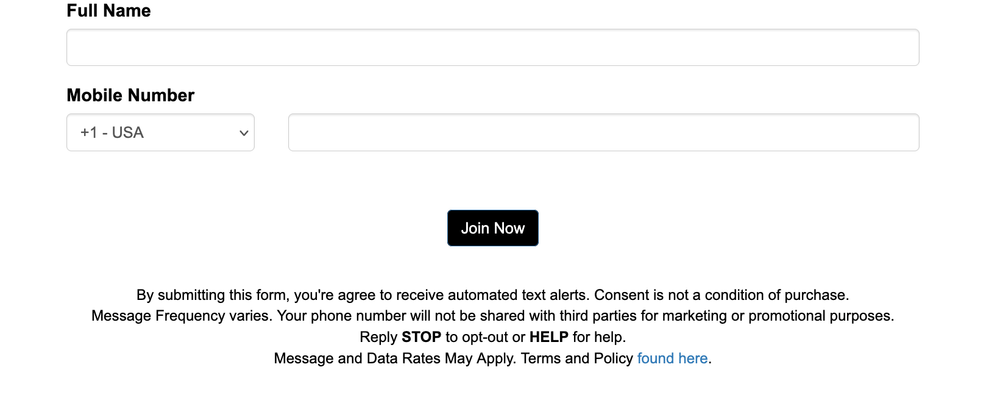 Add a disclaimer, “Message & data rates may apply,” along with links to your Privacy Policy and T&C.