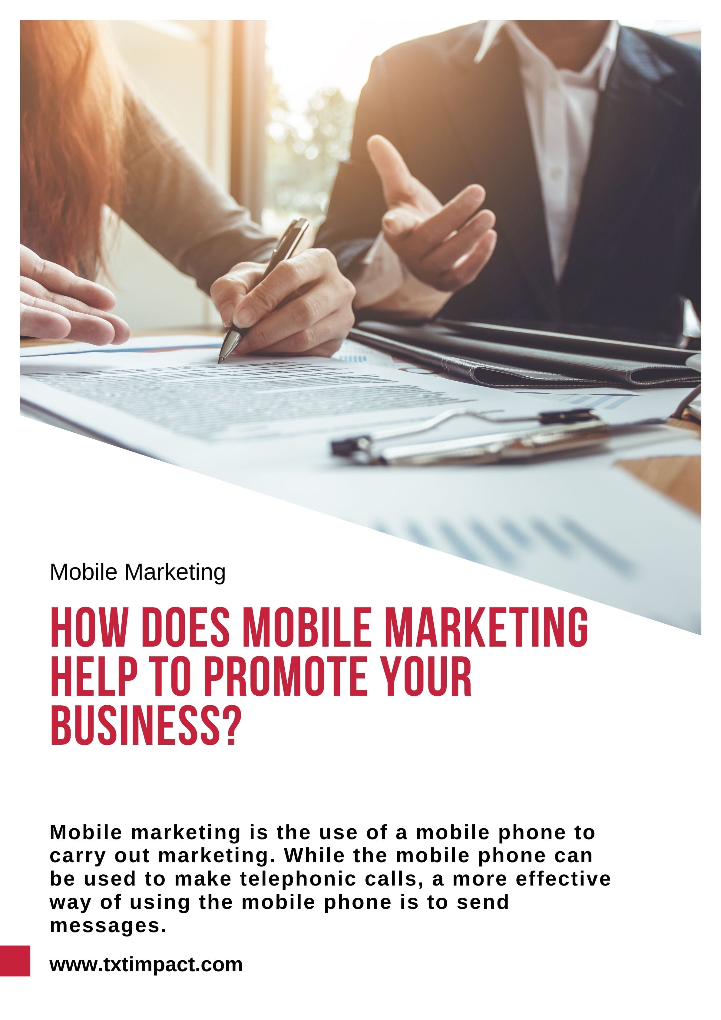 <h3>2) Use software to send messages</h3> Group Texting can be sent using the mobile phone. Sending multiple messages is easier if done using the software. The software can be used to send messages to any number of customers with the click of a mouse. Apart from sending promotional messages to all customers, personalized messages can be sent. Messages can also be sent to specific customers or customer segments, making it easy to run targeted campaigns. The message can also explain how a customer can decide to opt-out of receiving messages. This will ensure compliance with legal norms. <h3>3) Run a promotional campaign</h3> It is easy to run a promotional campaign by sending an <a href="https://www.txtimpact.com/excel-to-sms/">online text message</a> to customers. The message can contain details of a new product launch, offer, discount, or any such scheme aimed at promoting a business. The message can use a code using which customers can reply and avail of the offer. A link to the website can be sent in the message and the customer can use this link to buy online, availing the offer. Using such a link can be helpful in tracking the effectiveness of the promotional campaign. <h3>4) Using location-based campaigns</h3> Certain software can be used to track the geographical location of a mobile user. The software can then send messages to the customer informing of stores nearby that offers products the customer is looking for. This is a powerful way of using mobile marketing. When the customer walks nearby your store, he/she can get a message informing you that your store is nearby and he/she can purchase a particular product. This is an effective way of promoting a business. <h3>5) Interactive messaging</h3> Short codes or message codes can be used for interactive messaging. The Business Text message can send a code or keyword for the customer to use. For example, the keyword can be OFFR. If the customer replies to the message with this keyword, then the software can send additional information about the offers/product/service. The use of keywords can help in interacting with customers. It can be even used to get feedback from the customer. <h3>6) Update the customer</h3> SMS can be used to update customers on the status of their inquiry, orders, complaints, suggestions, etc. The moment a customer places an order, the order confirmation can be sent through SMS. Order tracking can also be done through SMS. The status of the order right from placing the order until delivery can be done through SMS. Customers can also get updates on the maintenance of the product, post-product service, warranty details, the status of their complaints, etc. This is very effective in engaging with the customer and is helpful for a business.For a business, marketing through text messaging is highly effective in terms of results that can be achieved and in terms of cost-effectiveness. If you are running a business, all you need is a text messaging software and a database of customers, you can easily use SMS to promote your business.